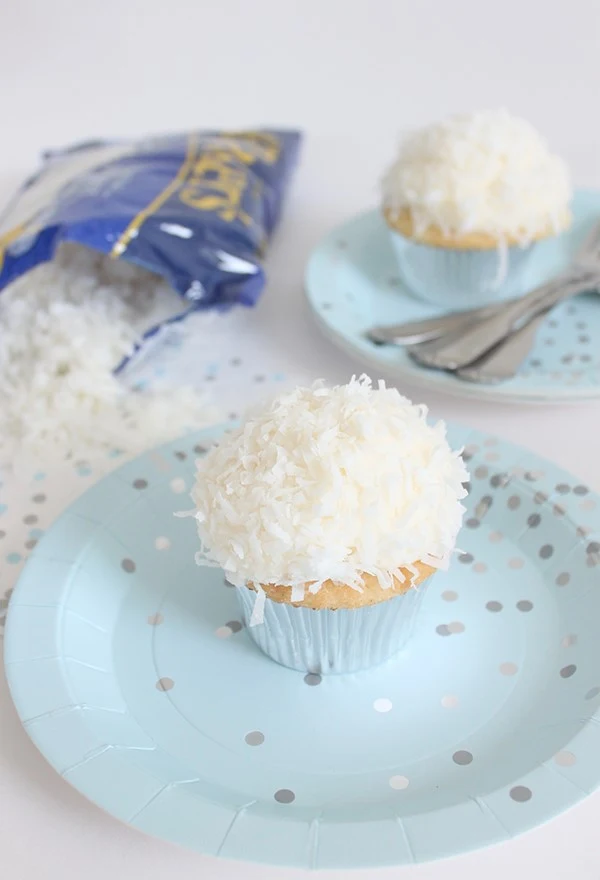 - Swirl coconut buttercream on top of cupcakes then dip upside down in the reserved coconut flakes to cover the tops and mound like a snowball.